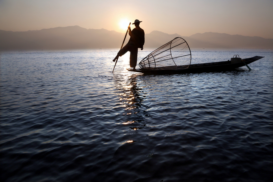 A fisherman showing off his age-old fishing technique at sunrise on Lake Inle, a freshwater lake located in the Shan Hills in Myanmar, creating a gorgeous backdrop for this quiet moment.