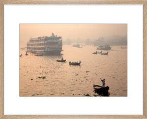 The golden shine coming through on the travel boats and little fishing barques alike, is due to the early sunrise glow on the bustling Buriganga river, flowing past the outskirts of Dhaka, the capital of Bangladesh.