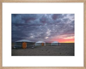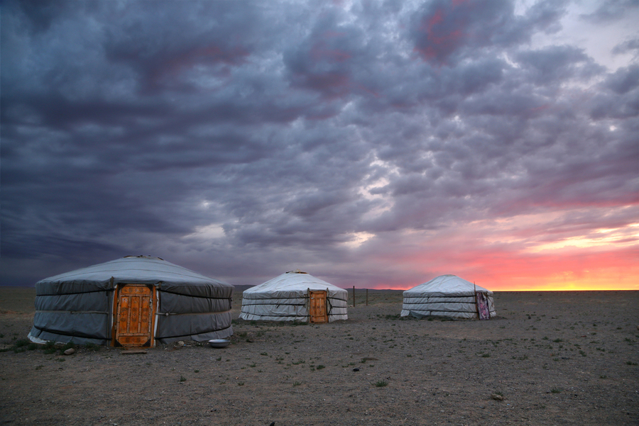 A pink light sets in at sunrise at a nomadic basecamp in the heart of the vast Gobi desert region in southern Mongolia. The tents are called gers, which in Mongolian simply means "home".