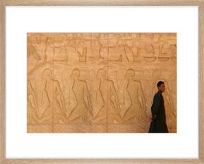 A young man is trudging next to the walls of the main entrance of one of the two grand rock temples of Abu Simbel in Nubia in southern Egypt.