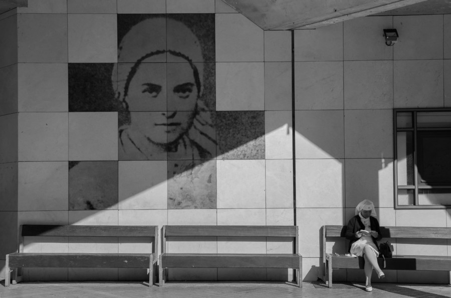 Taking a break from the procession, this nun has a solemn moment on a bench, posing next to a giant portrait of Bernadette; Marie-Bernarde Soubirous was the firstborn daughter of a miller from Lourdes and is venerated as a saint in the Catholic Church. The light that hits the patterned wall is a great addition to this interesting composition.
