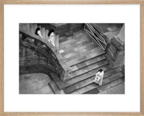 Three nuns come down the stairs after a praying sessions at the Lourdes Basilica of Notre-Dame-de-l'Immaculée-Conception. The bright and light robes of the moving figures contrast beautifully with the hardened granite stones of the stairway, letting the architecture come alive.
