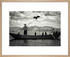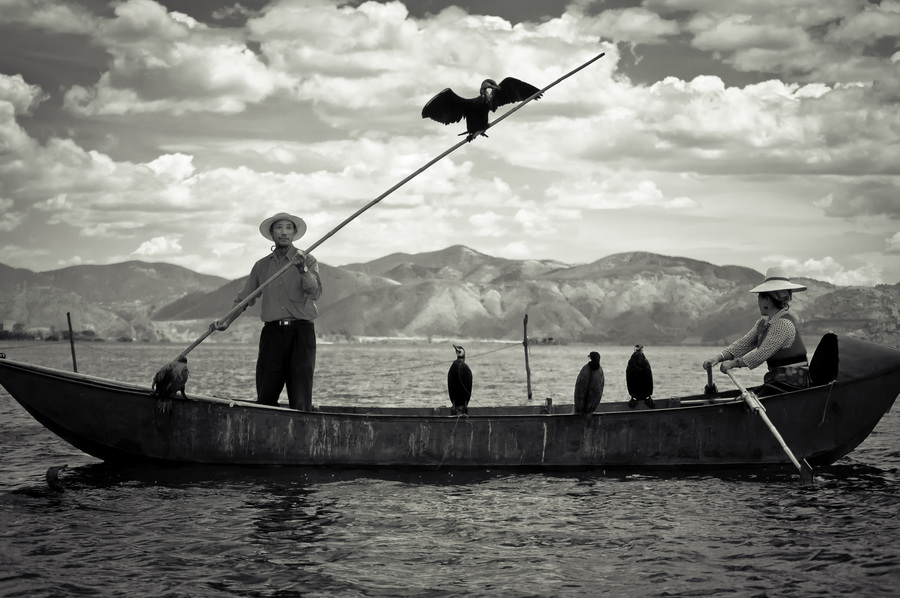 Cormorant fishing is a traditional fishing method in which fishermen use trained aquatic shags to fish in rivers, in this case in Southern China. To control the birds, the fishermen tie a snare around the bird's throat to prevent it from swallowing larger fish, which are held in their throat, while it can still swallow smaller fish. When a cormorant has caught a fish, the fisherman brings the bird back to the boat and has the bird spit it up.