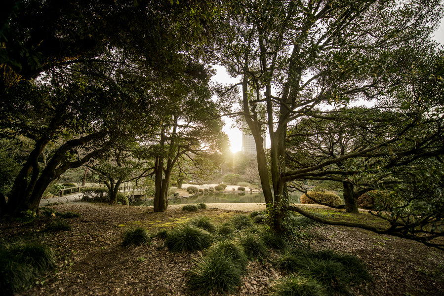 Shinjuku Gyoen National Garden was originally a residence of the Naitõ family in the Edo period and is now one of the many magnificent parks of Tokyo. The rising sun (no pun intended) lets you peek through the leaves to reveal the tall silhouette of one of the Japanese capital's 45 skyscrapers.