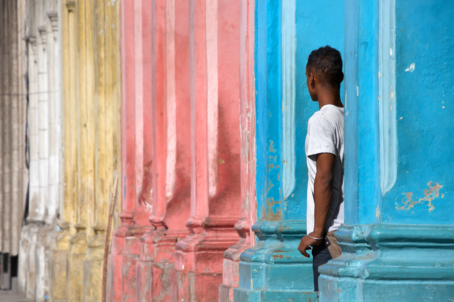 A young Cuban man stands tall amid the brightly coloured pillars from several neighbouring Colonial houses in the historic city centre of Havana. Since Cuba used to be a key transshipment point between the new world and the old world, many riches were brought to and through Havana by colonialists. As a result, it was the most heavily fortified city in the Americas and the influence from different styles and cultures can be seen in its colonial architecture, with a diverse range of architectural styles, from Moorish, Spanish and Italian to Greek and Roman.