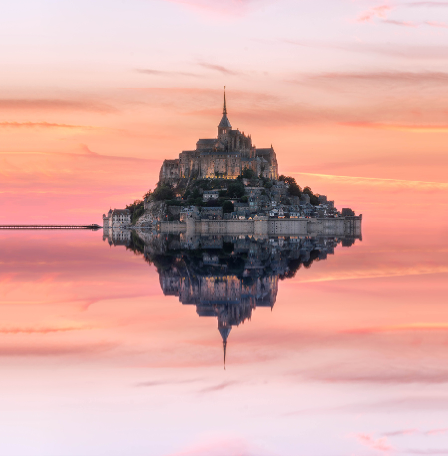 One of France’s most recognizable landmarks, the Mont Saint- Michel in Normandy, is visited by more than 3 million people each year, while its own population barely hovers around 40. Besides the capital this is the most visited monument in the country. The sunset reflection renders it almost like an abstract creation.