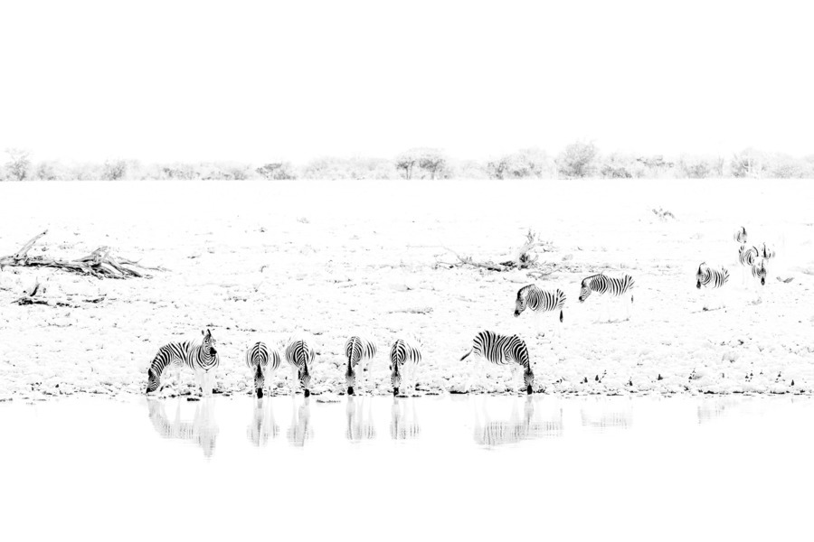 Summer barely started in Etosha National Park in northern Namibia and, after months of drought, the land is arid and the waterholes are almost depleted. For this dazzle of zebras, access to water is truly a matter of life and death.