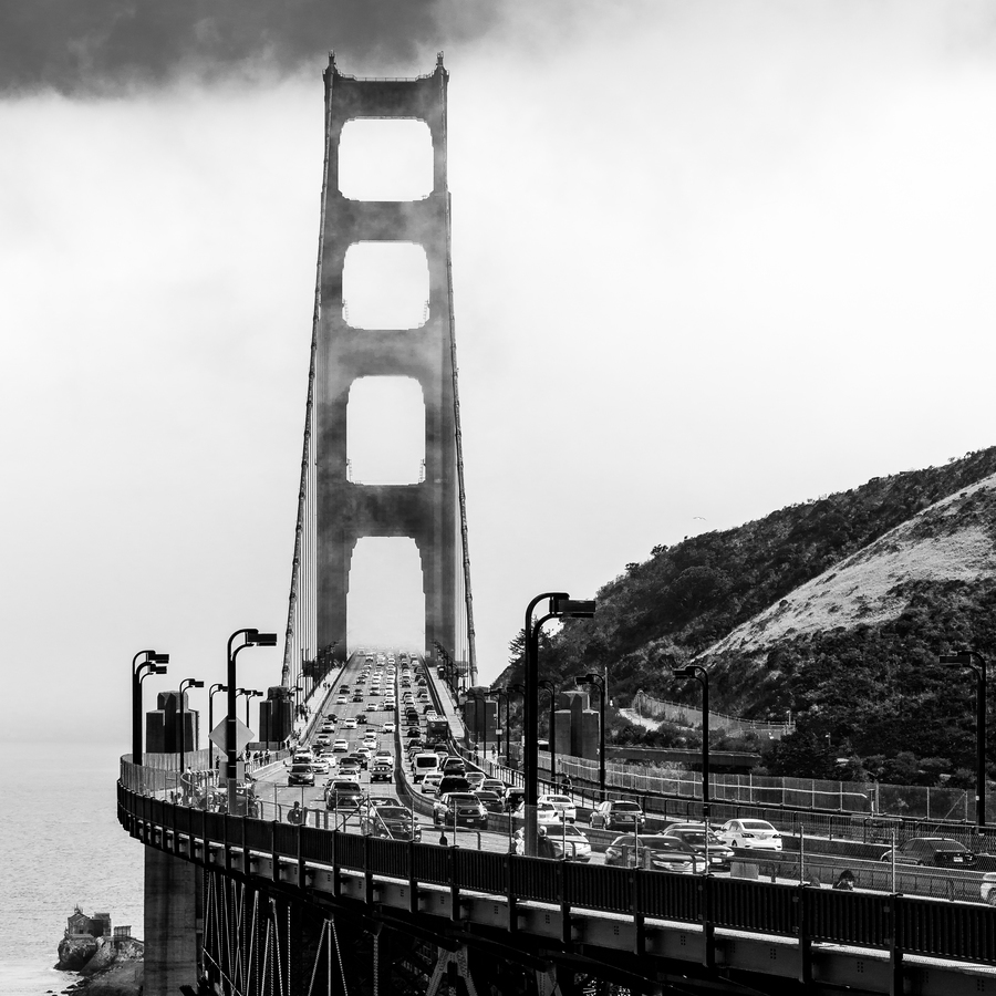 A postcard-like picture of the world famous Golden Gate Bridge in San Francisco Bay. Because of the ever-present fog, it is extremely difficult to photograph its entirety. But the cloudy haze has almost become synonymous with the bridge itself.